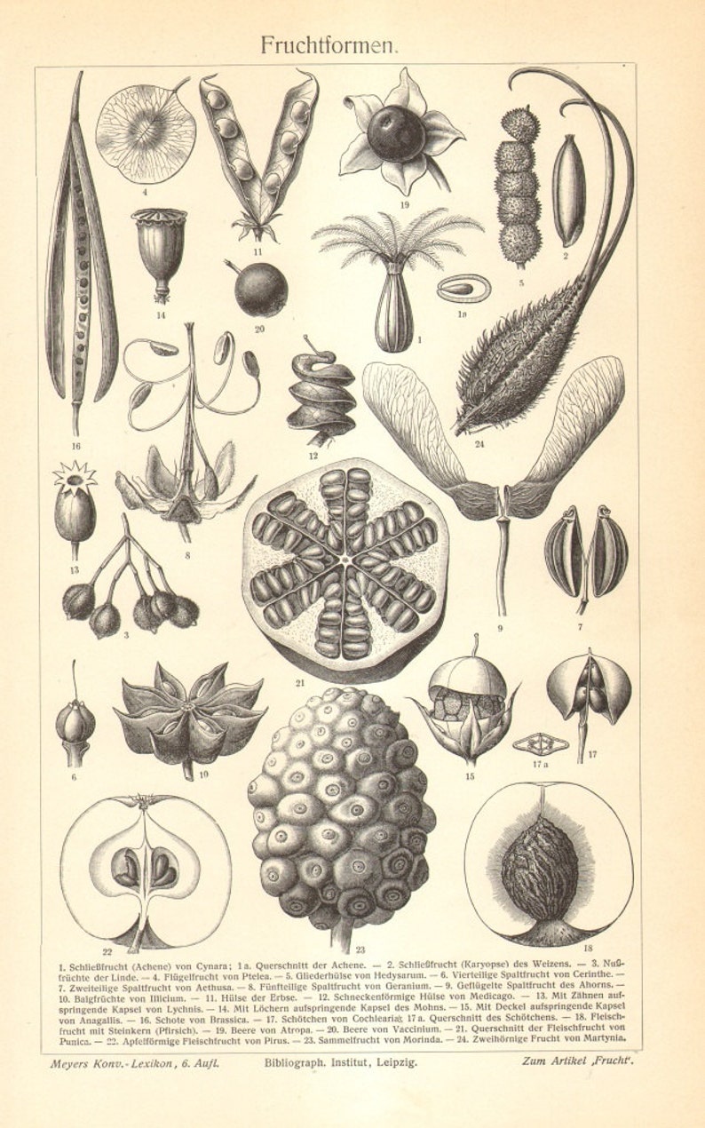 1904 Fruit Forms And Types Sweetvetch Cerinthe Fool S Parsley Lychnis Papaver Peach Atropa Vaccinium Punica Pear Antique Engraving